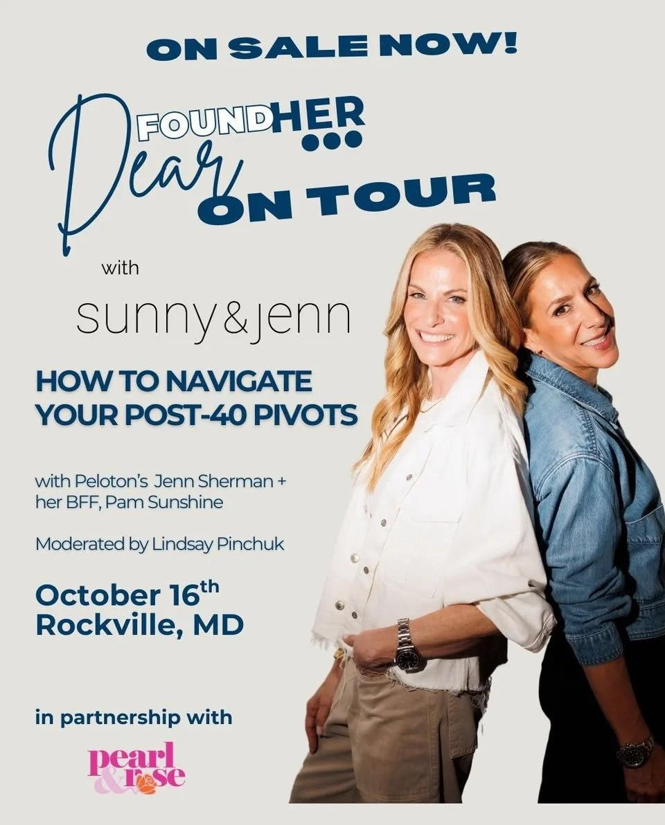Dear FoundHer... Top 1% podcast and community for women 40+, is excited to bring their most popular guests, Peloton's Jenn Sherman and her BFF Pam Sunshine, aka Sunny + Jenn, to the DMV!